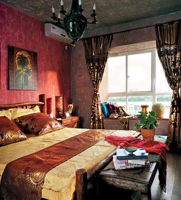 香艷的橘紅色墻壁與濃郁的深褐色地板將居住者包裹在風情萬千的臥室之中,寬大的飄窗增加了幾分現代的氣息,杉木制成的大床與華貴的床上用品相互補充,古樸與奢華和諧地并存著。