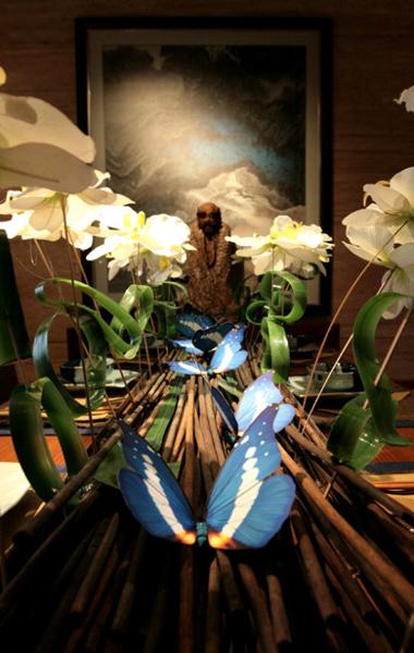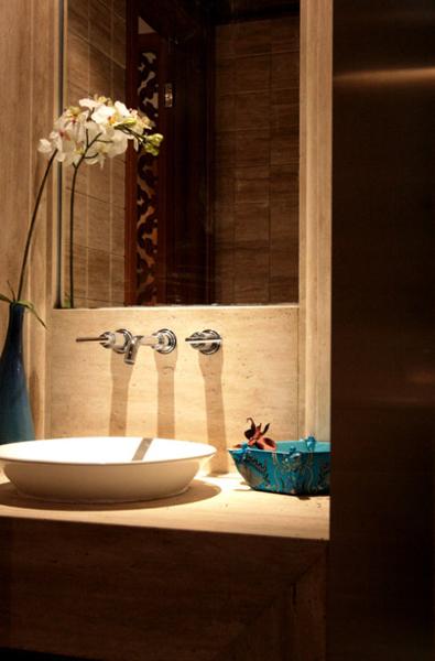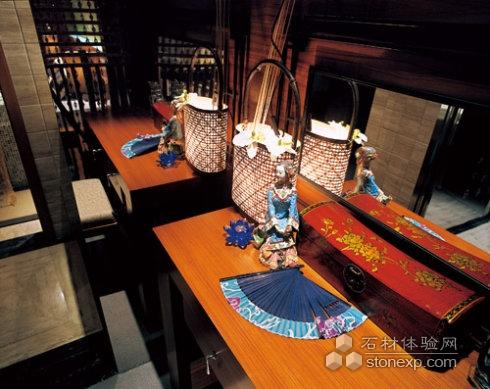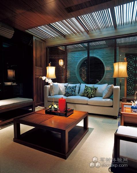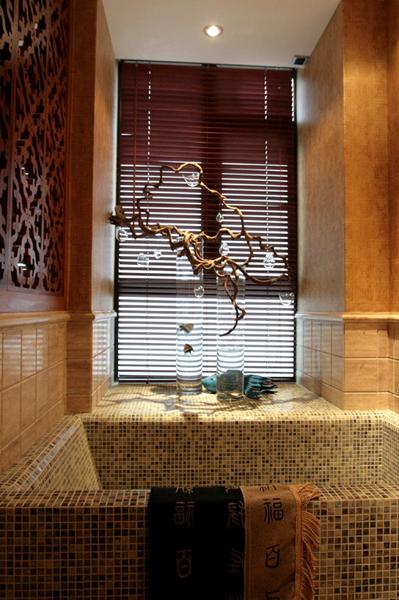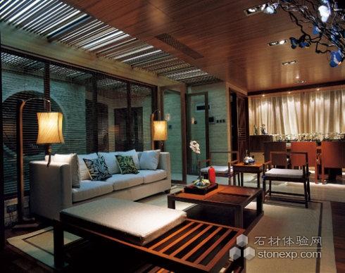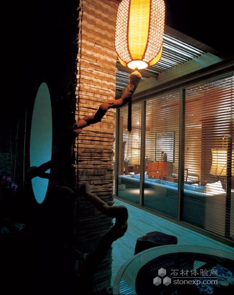 當(dāng)踏入門廳,入戶花園的山、水、竹林、木雕,給人以世外桃源的感受,宮燈、鳥籠、古井、枯枝、茶具、青磚……無不體現(xiàn)東方的神韻。枯井的形式采用現(xiàn)代功能的手法,透過玻璃制的鏡面看到游水的魚兒。欣賞窗外美景,看魚兒嬉戲,啜一杯清茶,使人仿佛置身于都市的另一領(lǐng)域——休閑、寧靜、平和……