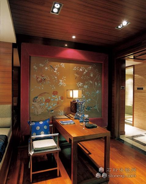 由于時(shí)間關(guān)系,綠竹還沒有種上,但隨意的畫卷、陳竹、卵石已有了庭院竹林的意境,作為劃分空間區(qū)域之用的推拉門,也別有一番韻味,同時(shí)對(duì)小空間采光達(dá)到了很好的輔助作用,甚至可以引進(jìn)陽光。書房在竹子的映襯下,頓悟了蘇東坡先生:“可使食無肉,不可居無竹……”。書房的陳設(shè)中挑選了江南少女的雕像在木質(zhì)雕花的映襯下展現(xiàn)其婀娜多姿,來改善中規(guī)中矩的書架的呆板。