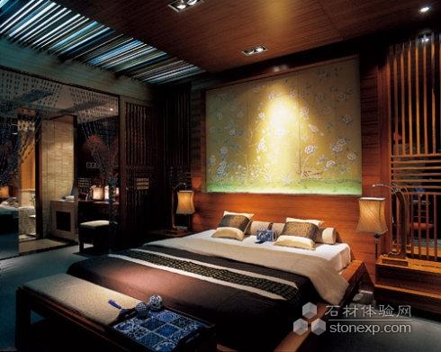 一幅柔和的絹絲畫、珠簾在風(fēng)中搖擺,泛灰色的布幔讓整個(gè)空間彌散著浪漫、柔和的氣息,通過珠簾幕讓主臥與化妝間既有聯(lián)系又有分割,而且給主臥添增了一道風(fēng)景,意在營造舒適、寧靜的休息空間。次臥借用古代臥室的做法,采用睡榻形式讓主人“養(yǎng)精蓄銳”之時(shí)也頗有幽古之思,也是主人休憩、品茗的另一空間。