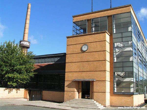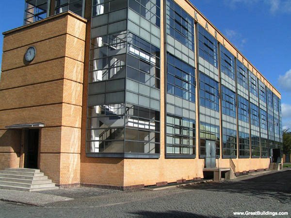 薩克森—安哈爾特州德紹的包豪斯建筑。它建于1925—1926年,為包豪斯學校設計,是格羅皮烏斯的代表作。校舍面積約一萬平方米,共分三部分:1、教學樓,2、生活用房(包括學生宿舍、飯廳、禮堂、廚房、鍋爐房等,宿舍為六層,其余為兩層),3、四層的附屬職業學校(與教學樓由過街樓連結)。后兩部分均為混合結構。從學校步行五分鐘即到教員的小型住宅區。設計強調實用功能,充分利用現代建材、結構,表現簡潔、通透,用不對稱的造型來尋求整個構圖的平衡與靈活性,用非常經濟的手段表現出嚴肅的幾何圖形。包豪斯創立發展階段恰逢第一次世界大戰后德國百廢待興的時期,為了有助于解決平民百姓的住房問題,包豪斯著重研究小面積住宅和建筑工業化,并注意建筑單體與群體、建筑與環境的和諧問題。包豪斯的設計從房屋到茶壺、臺燈,汗牛充棟無所不包。在日常生活用品的設計中,包豪斯強調設計家要著眼于工業大生產,要為大多數人生產實用美觀的物品,而不是為少數的富豪生產奢侈品。