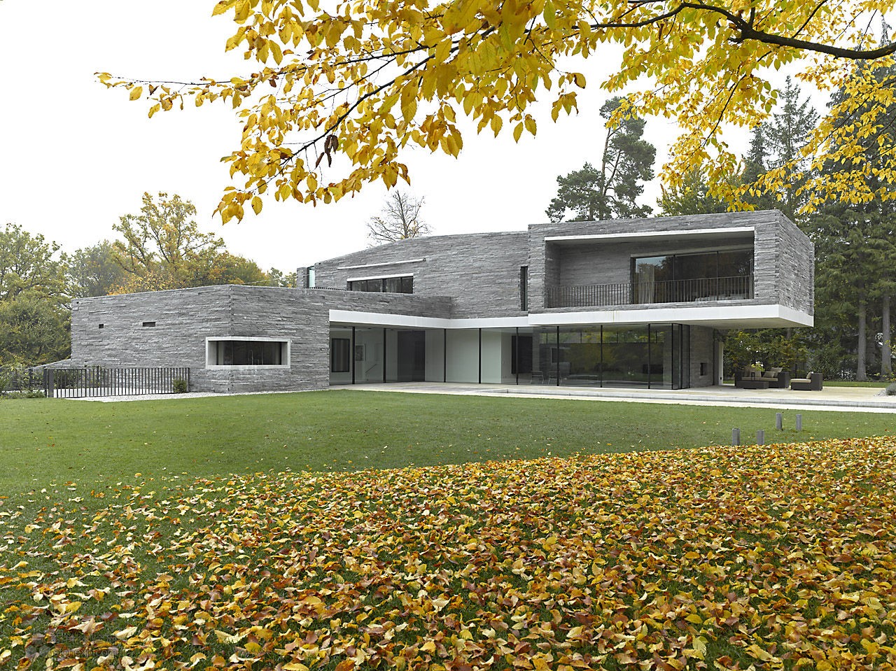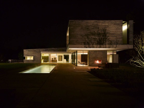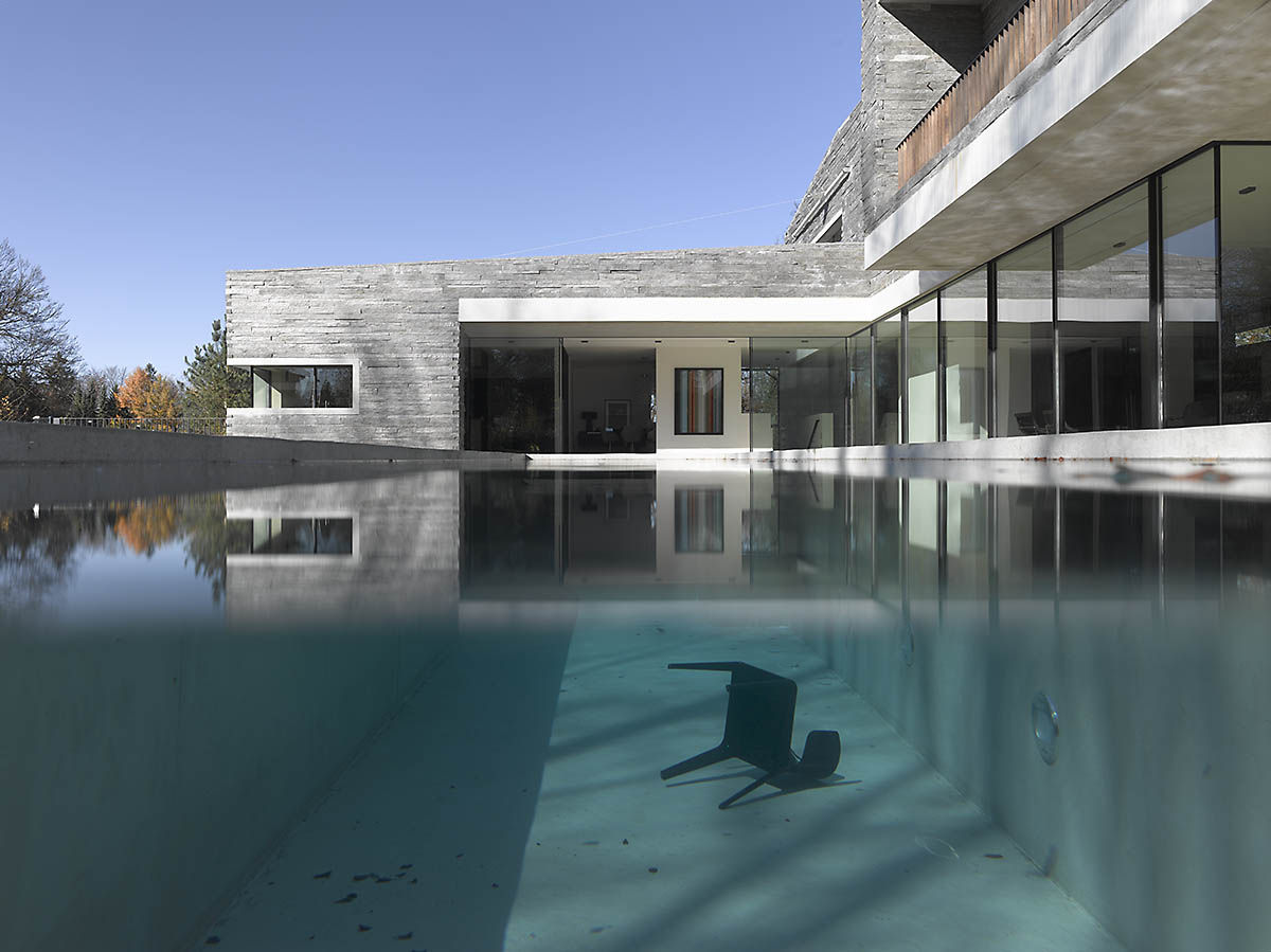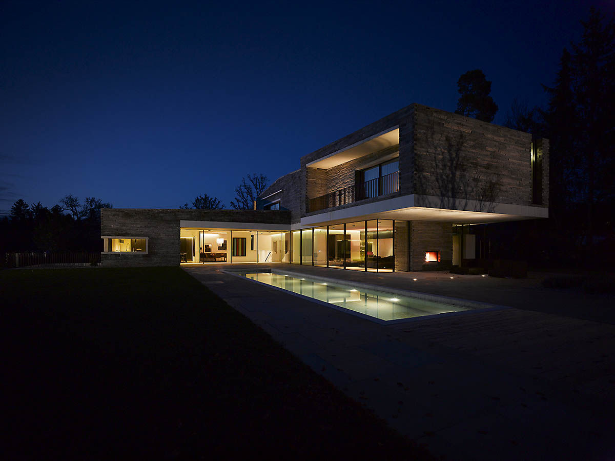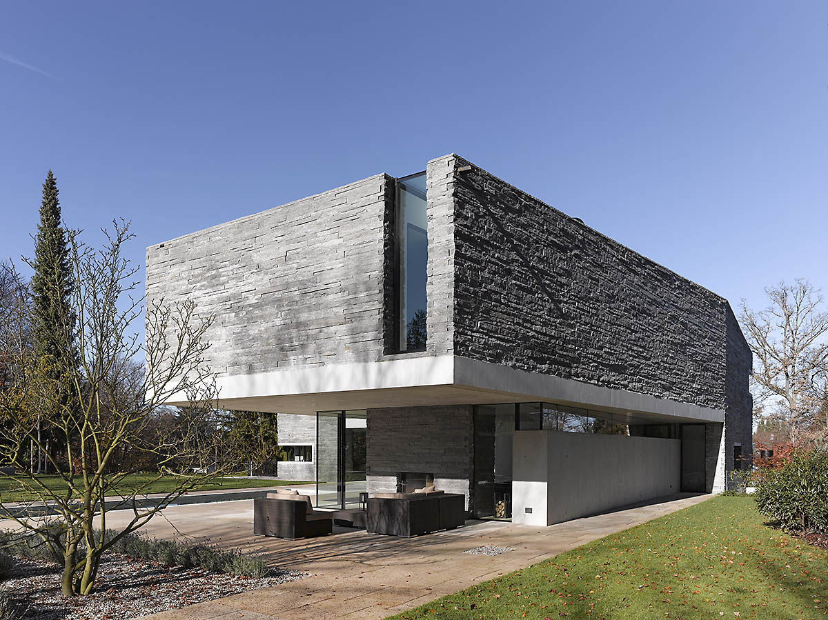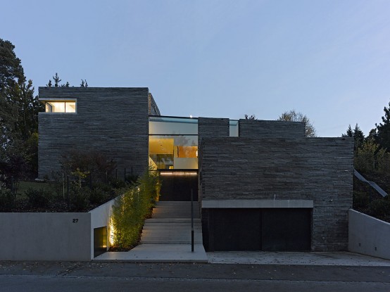 這幢時(shí)尚、現(xiàn)代的住宅由德國(guó)建筑師Titus Bernhard 設(shè)計(jì)建造。房子的顯著特點(diǎn)在于北面穿越了一兩層高的斜坡,最終與花園的地面持平。而且整幢房屋的外墻全部采用表面粗糙的石材打造。