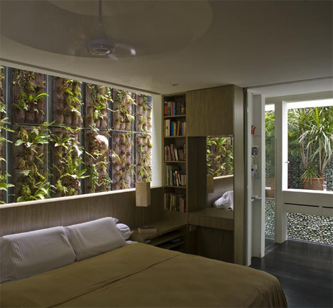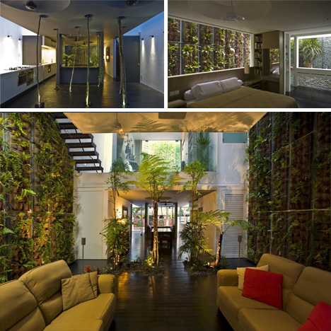 此房子的室內設計以黑白為主色調,及其簡潔。然而室內隨處可見的綠綠的樹木以及爬滿墻上的苔蘚,卻讓人仿佛置身叢林。各種綠色的大小樹木、苔蘚穿梭在鋼筋、水泥、玻璃之間,與室外的綠化相呼應,甚至弱化了室內室外的概念,堪稱真正的生態之家!
