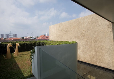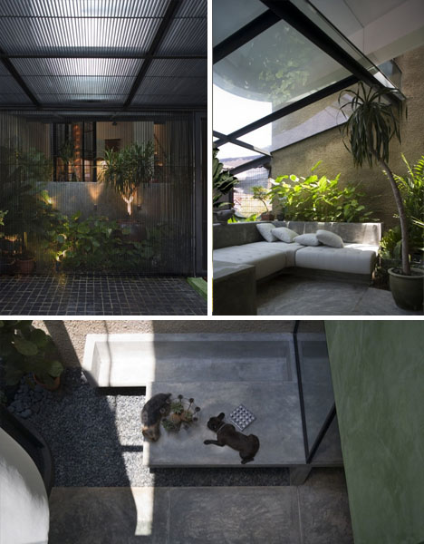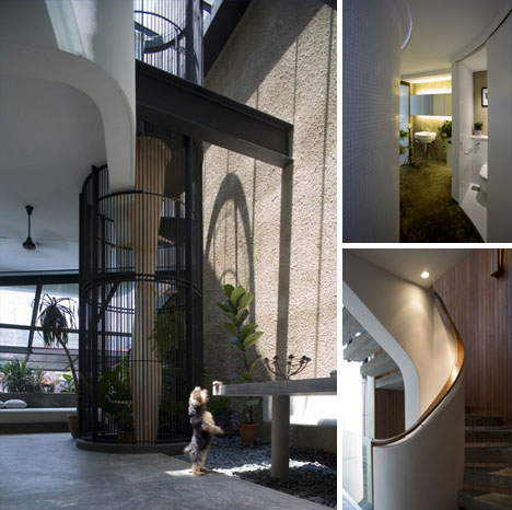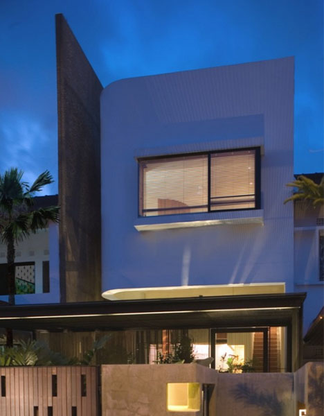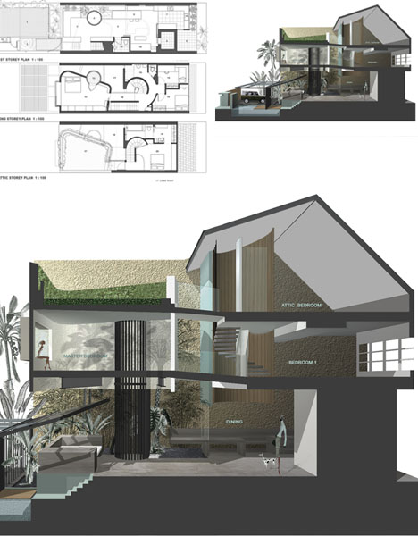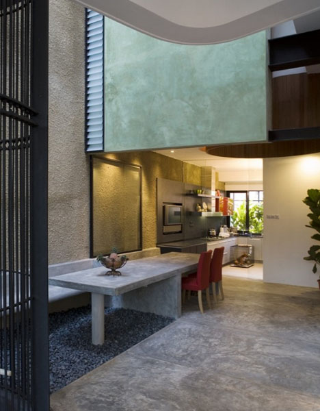 除了面向街道的一面,房子的其他三面都是不可逾越的墻。要在這樣一個狹窄的空間建一座足夠空間、光線良好、空氣流通的住宅是很難做到的。然而得益于新加坡的氣候條件,建筑師Formwerkz 使房子的每一面都能流入新鮮的空氣。白色的墻壁以及木材、花崗巖、綠色植物等等元素的運用,讓整個室內活潑、富有生氣。