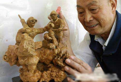 陳登棋老人修整自己創(chuàng)作的牯石雕塑作品《地震無情,中華有愛》