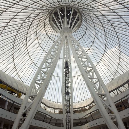 “沙特爾可汗”大帳篷用時三年半建成,據(jù)說是世界上最大的帳篷,更準確點說,應(yīng)該是世界上最大的張力結(jié)構(gòu)。一條高492英尺(約合150米)、重2000噸的三腳桅矗立在“沙特爾可汗”帳篷中央,支撐起巨大的鋼索網(wǎng)和三層透明塑料,這三層塑料在令陽光進入的同時,還能保持里面的熱量。這個工程需要650名專業(yè)攀巖者,同時還必須對施工日期做出精心安排,以避免在寒冷冬季工作,因為哈薩克斯坦冬季溫度可下降至華氏零下40度。丹西說:“這是在為阿斯塔納市民創(chuàng)建一個可以全年享受的地點。”