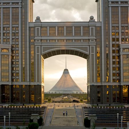 在這張攝于今年6月的照片中,“沙特爾可汗”大帳篷處于哈薩克斯坦國家石油和天然氣公司(KazMunaiGas)阿斯塔納總部的拱道中央。丹西解釋說,與意大利的比薩斜塔不同,“沙特爾可汗”大帳篷是被故意設(shè)計成向一側(cè)傾斜:“根據(jù)我們的總體設(shè)計方案,‘沙特爾可汗’與阿斯塔納整座城市的總體規(guī)劃相符合,為該市令人印象深刻的中軸線提供一個終點。”“沙特爾可汗”大帳篷位于貫穿阿斯塔納城區(qū)中軸線的人行道的終點,另一端則是被稱為“和平與復和之殿”的金字塔狀文化研究中心,這棟建筑也由福斯特建筑設(shè)計事務(wù)所設(shè)計。
