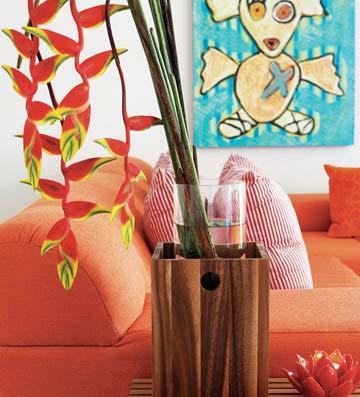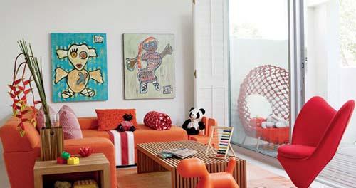 紅色跟橘色作為主調并不是很容易把握的,因為大面積此類顏色的使用容易使人感到煩躁,而這間客廳的搭配卻恰到好處。墻壁摒棄了花色的壁紙,保留純白的底色,只掛了兩幅充滿稚拙童趣的畫作,并以簡潔明快的天藍色打破視野中紅色占據的僵局。