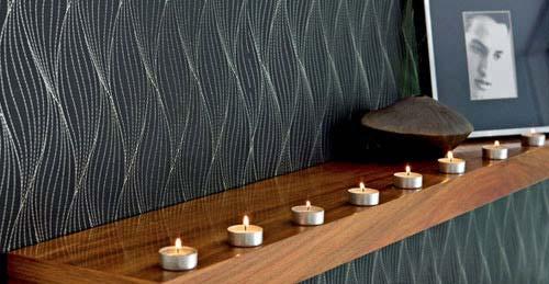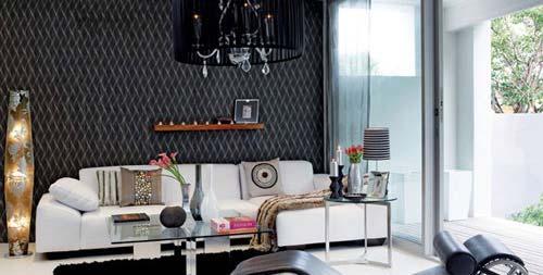 墻壁大面積使用黑底白紋的圖案,給地板留出足夠簡潔的空間。沙發上方做出的原木架將發散的目光重新聚集,照片擺在一側,圓扁的小蠟燭悄悄亮起,讓氣氛一下活躍起來。水晶吊燈線條優美,外面籠罩了一層黑色豎紋裝飾,與沙發前純黑的地毯遙遙相望,而躺椅完美的弧度在提供給主人充足的休息之余,也配合著前兩者成為屋內最為深暗的色彩之一。橫排的白色沙發顯露出十足的貴族氣息,高高豎在一側的地燈也相應地做出漂亮的大花圖案,亮燈時花朵若隱若現,朦朧之美呼之欲出。