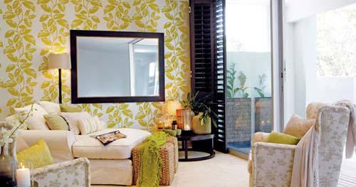 地板與墻壁的顏色,永遠是房間內值得細細斟酌的搭配游戲。上來便確定了混入黃色的綠調,可以使氣氛看起來單純又有活力。墻壁上蜿蜒的藤蔓一字排開,圖案舒展而飽滿,中間的鏡子大面積提升了房間的明亮感;而地板只選了干凈的純色作為映襯,主次分明。
