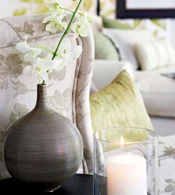 布藝沙發也同樣遵循了花色與純色混搭的原則,奶白色的雙人沙發用淺灰綠的靠包來點綴,分坐兩旁的單人沙發則使用枝葉與花朵的暗紋來處理,旁邊配上深色的小茶幾,精致的圓肚細頸花瓶里悄悄探出一枝素雅的白色蝴蝶蘭,跟玻璃罩內點燃的白色蠟燭相映成趣。