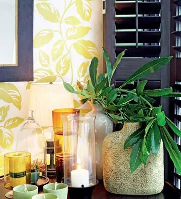 整幅畫面中最為濃重的一筆當屬貼近窗邊的角落,一樣是深色圓茶幾,上面擺放的花瓶十分古樸,插花也顯得更為隨性和張揚。蠟燭不再是單一的白色,茶綠色的三杯小蠟自成一體,身后還藏著黃色的蠟燭與玻璃器皿。