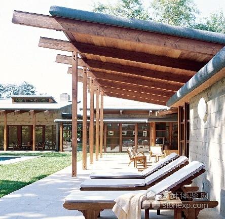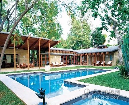 以院子里的水池為中心,一圈整齊優(yōu)雅的平房建筑環(huán)繞四周。建筑材料全部采用木頭和混凝土。大扇的透明玻璃門窗銜接起室內(nèi)外的空間。房子后面就是個(gè)山坡,每天晚上都能欣賞到如戲劇般美麗的日落。4英畝的占地面積,足夠奢侈地種著桔子樹、橡樹、小無(wú)花果樹和常綠的喜馬拉雅雪杉等高大的喬木,這也讓庭院和房子有了層次分明的景致——建筑師皮特·托爾金稱之為“加州的神話”。