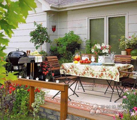 桌布:選擇代有絢麗大花的桌布能營(yíng)造出溫馨的田園氣氛,讓整個(gè)露臺(tái)充滿迷人的風(fēng)情。這樣的桌布可以自己買面料制作。