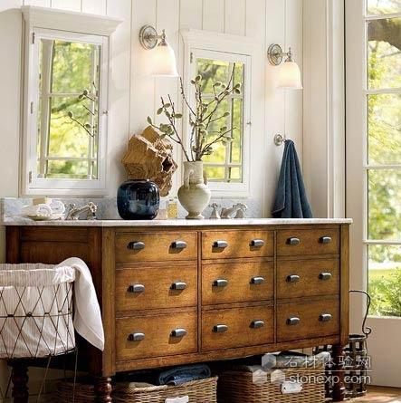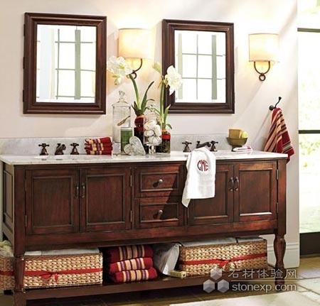 厚重沉穩的實木家具是美式風格的主角,同樣采用這種質樸的木質浴室柜搭配美式風格的雙人臺盆區,顯得格外溫馨自然。這款雙人實木臺盆柜具有相當多的收納空間,而且可以將開放式的底部用于收納籃的擺放,增加收納區域。毛巾可以用仿古金屬掛鉤收納,同樣能搭配質樸的美式效果。