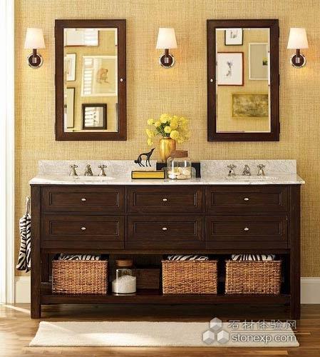喜愛新中式風格的家庭,潔具上往往很難布置出效果,因此可以采用仿古造型的浴室柜,來讓浴室也充滿新中式感覺。用做舊的材質和仿古的設計制成的雙人臺盆柜,擁有懷舊的中式風格效果,全封閉的收納效果頗有局限性,可以增加收納籃和收納筐增加開放式收納的區域。