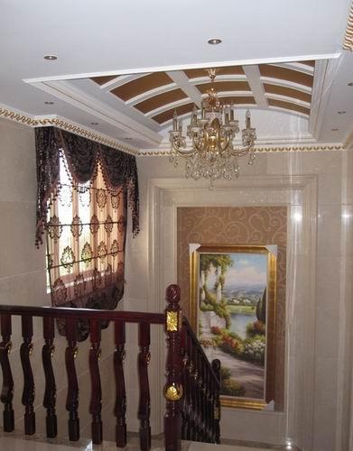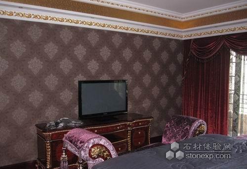 深色的歐式墻紙。頂上的PU線條描金給人營(yíng)造出雍容華貴的感覺(jué)。