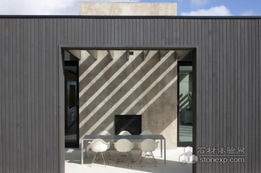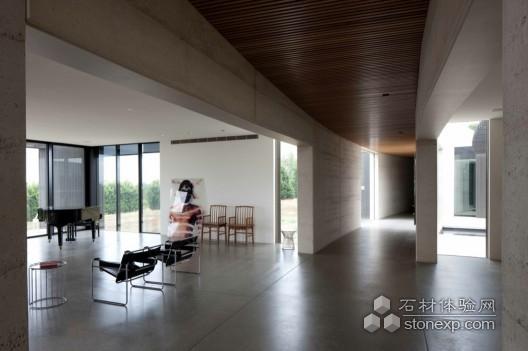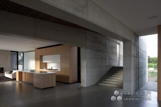 這個住宅鳥瞰莫寧頓半島,一條長長的彎曲的車道穿過葡萄園到達住宅。剛接近住宅時,它給人一種陌生感,呈現出抽象且謙虛的立面。住戶可以通過兩面土墻進入,長長的走廊彎曲向前,為人們展現木質的天花板吊頂。巨大的窗戶張開南面葡萄園驚人的美景,北面一條水池橫切院子,倒映天空。