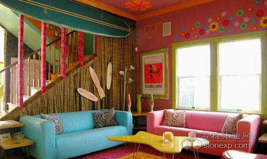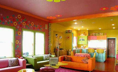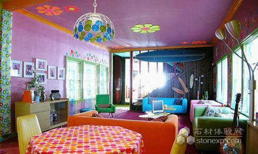 鮮亮的顏色加上細碎的花朵圖案,為居室帶來熱鬧的景象。而棉質布藝軟包的家具是承載艷麗色彩的最好材質,能很自然地化解多色系對視覺的刺激,只留下跳躍的色彩渲染空間氛圍。