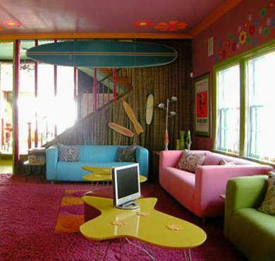 清亮的繽紛色于房頂和墻面上開放出朵朵鮮花;樓梯走道邊的扶手和墻體被裹上流蘇布條,遠遠看去像極了一條歡歌搖曳的草裙,沖浪板的裝飾立刻把你帶到夏威夷的海邊。