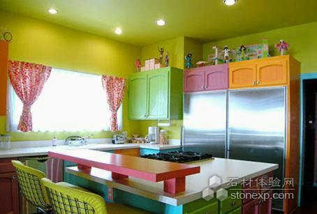 廚房的配色如同兒時的積木游戲,每一面廚柜上都運用了不同的色彩,廚房開始了從未有過的亮麗風采。中間的島臺上加高了一側邊緣作為吧臺,增加了其實用功能。