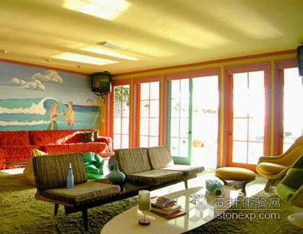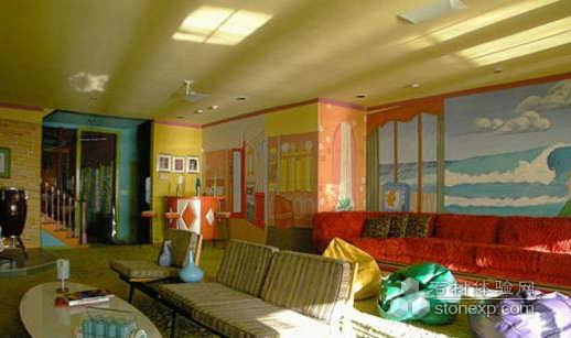 度假別墅打造重點是其能夠使人放松身心的特殊功能,而這個娛樂室的落地窗正對室外游泳池,房間的布置應景地打造成海邊景象。地毯的色彩及質感好似沙灘,墻面上手繪出大海的畫面,各種不同的沙發隨意放置,就如同大家來到海邊享受日光浴。