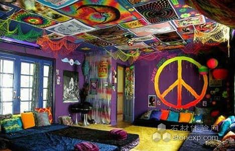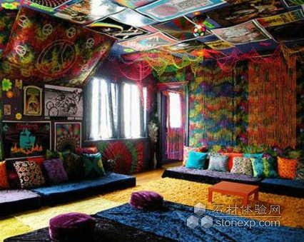 各種宣傳海報貼上房頂,除此之外,靠包的顏色也是不盡相同。臥室選用日式榻榻米的床墊,絲絨面料軟包的床墊體感輕薄舒適,且可以容納下更多在同一個房間里休息夜聊。