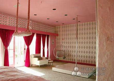 如果說前者適宜結伴入眠,這個臥房就是獨處的專利。墻面和床品上的線條花紋如同流水惹人幻想;粉色至紅色的漸變運用,盡管色調清淡,卻透著活潑而不失溫柔,營造家居夢幻境界。