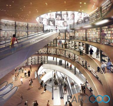 設計者Mecanoo事務所公布的兩張圖片顯示了在世紀廣場上建造的新的戶外劇場以及圖書館內中央圓形大廳的雛形。