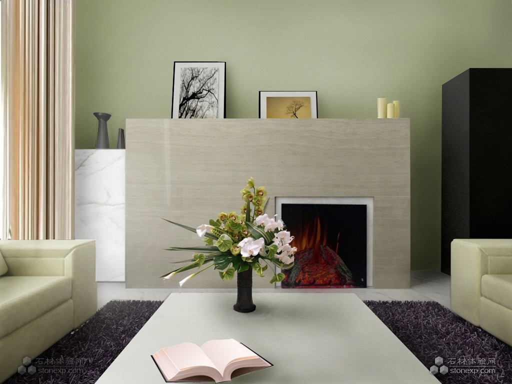 此設計為現代風格家居中的客廳一角,簡潔的線條、清新的色彩、隨意擺放的裝飾畫及新式壁爐的使用,強調現代人及簡的生活態度及獨特的韻味,為許多80后的年輕人所喜愛。地面及壁爐以雪花白及意大利木紋石搭配運用,更加突出了空間主人對生活的高品質需求和高雅的格調。