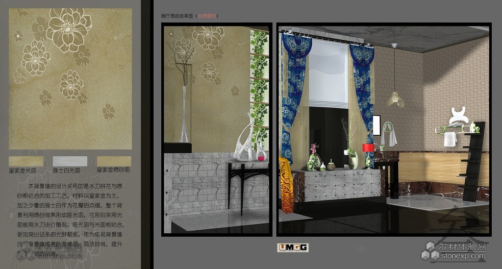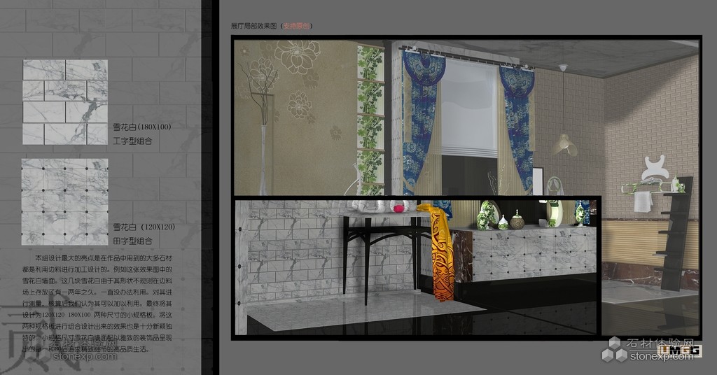以這一理念為出發,進行思考:山東公司邊料廠上的邊料主要是以前工程切下來的不規則的或是較小體積的石材。例如,紫羅紅、銀灰洞、黑白根、皇家金、羅馬米黃以及一些其它品種、將它們重新再用大型的工程上的機會很小。這次設計中我們就是對其進行測量核算。認為根據這些石頭大小、不規則的特點將其切成小規格板進行重新組合,也別具匠心。