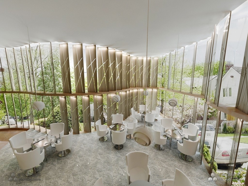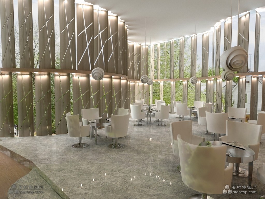 簡約、回歸自然是當下較流行的一種設計風格,這套設計是一個高級會所餐廳部位,主要材質是符合當下流行的低碳環保材料,運用了環保性較高的石材使整體更親和自然,整體外形呈曲線,玻璃墻上做了個像百葉窗的造型,運用我司的25mm木紋石(光面)中間鏤空,可以控制百葉的方向來達到最佳采光效果,地面采用我司的圣羅蘭(光面)通過它的自然紋理運用使整體效果不過于呆板,整體風格自然清新,比較有張力!
