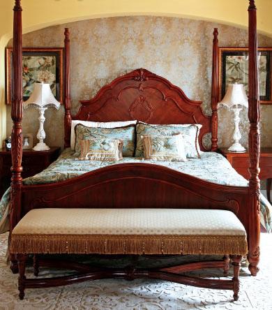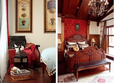 3、紅木吊頂 主人臥室與大會客廳的風格一致,同樣是紅木吊頂和紅色的壁紙,加上尊貴的復古大床,延續了整體的奢華感。
