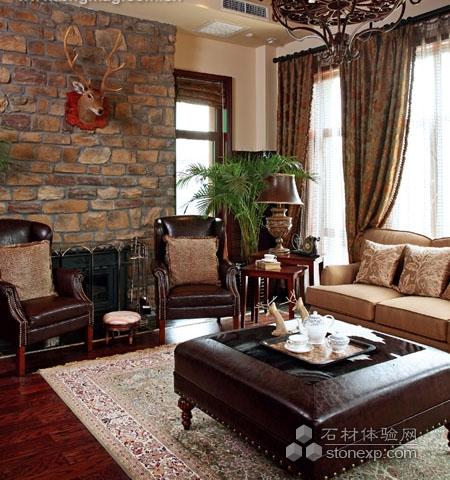 多種貴族質感 充滿美式野性的大會客廳,紅木的吊頂裝飾與毛石的墻面相得益彰,鹿頭裝飾更增加了美國西部的感覺。