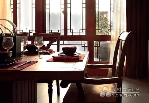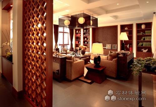 設計師蕭愛彬強調,雖然中式風格最有中國文化底蘊,但設計師應該更關心如何在傳統的居室氛圍里面融入現代生活。從進門的客廳、餐廳,都可以看出是運用了簡約的語言,體現了東方的情調;透明的連續的排列的處理方式就很強烈地體現出了濃濃的東方色彩和現代的東方情調。對傳統元素的小小改良,使整個空間新鮮起來。