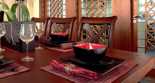 現代中式餐廳 實木的餐桌上面,黑紅搭配的餐具是極具現代感的中式;具有強烈存在感的造型插花和綠植也是調節氣氛的好物件。