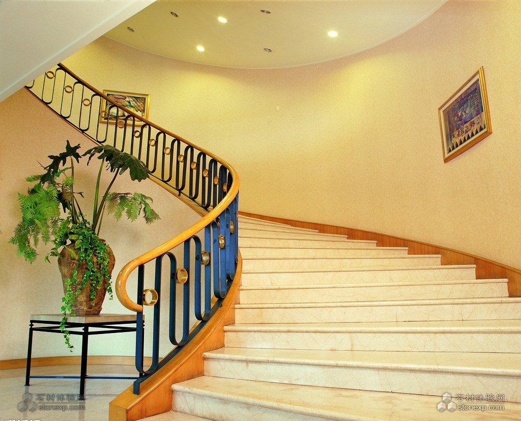 自下而上的旋梯,曲線自然。扶手采用實木和鐵藝的結合,營造出古典的氛圍。