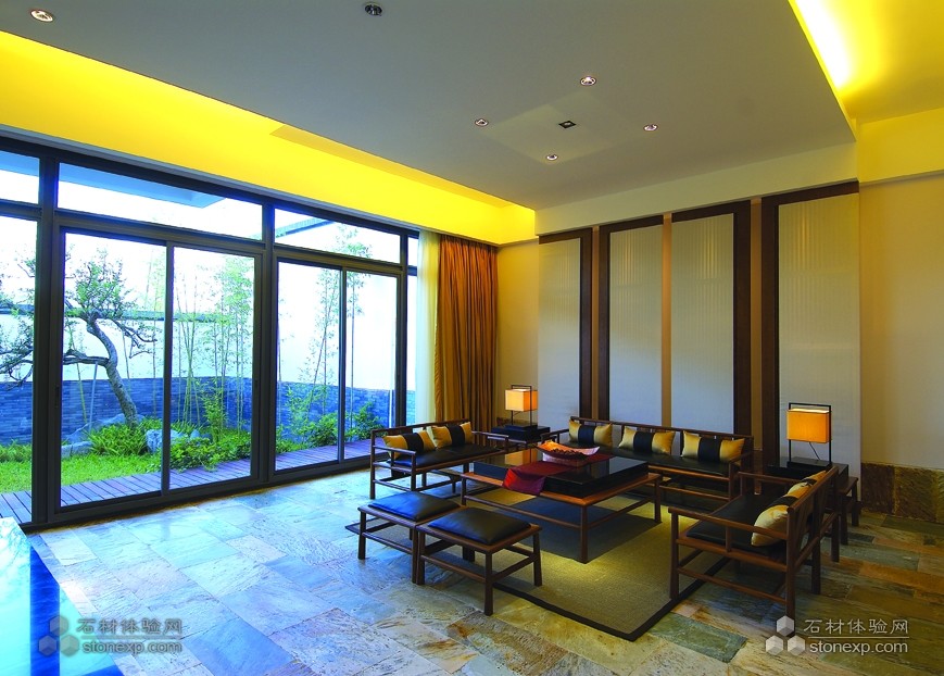 仿古面石材地面,石材表面經過了特殊處理。顏色較深,搭配中式家具,讓整個客廳空間古樸莊重。