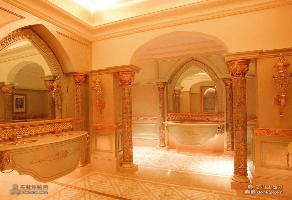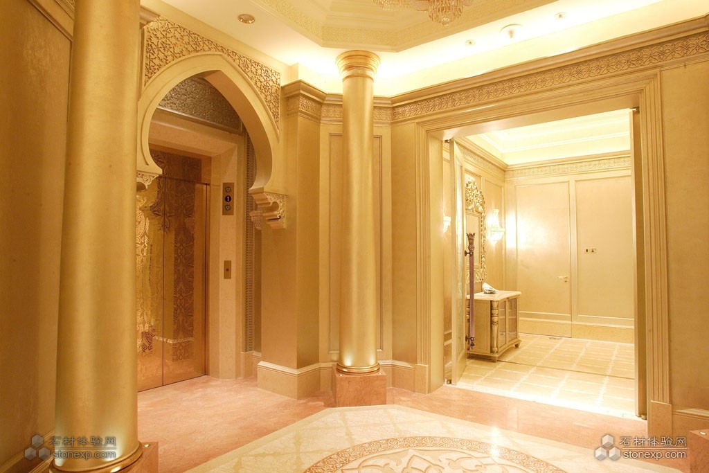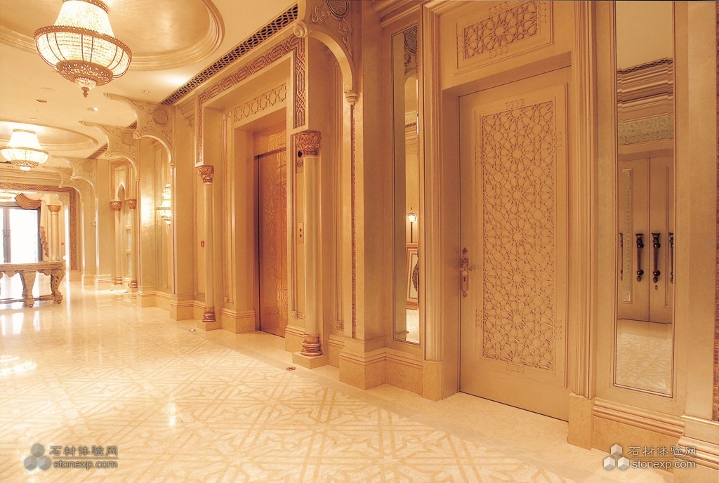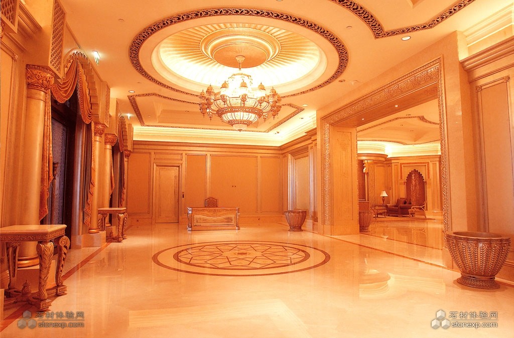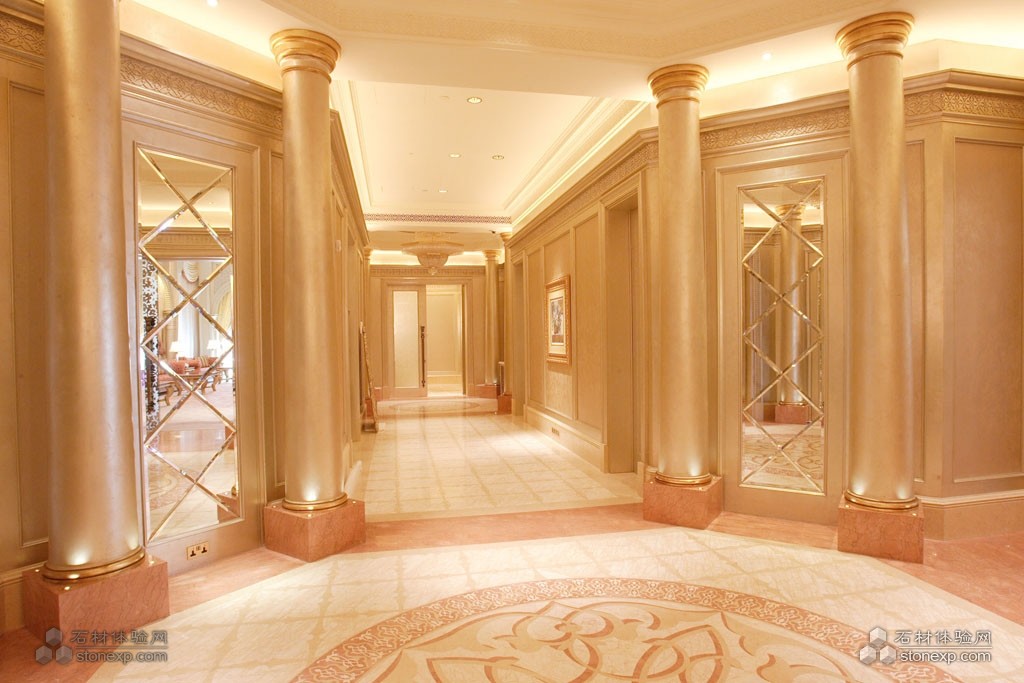 阿聯酋皇宮酒店,被譽為世界最豪華、八星級的酒店,香港環球石材集團在與意大利等國際公司激烈的競逐中,憑著突出的資源優勢、技術優勢、統籌大型與超大型工程石材的豐富經驗而中標,成為唯一入圍的中國公司。整個工程耗資逾30億美元,耗費近150000立方米的進口大理石,而酒店的核心部分,包括總統套房、部長套房、總統及部長Lobby、VIP入口等部位的裝飾石材均由香港環球石材提供。
