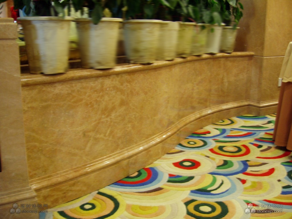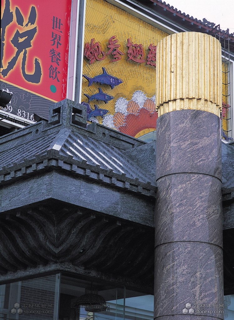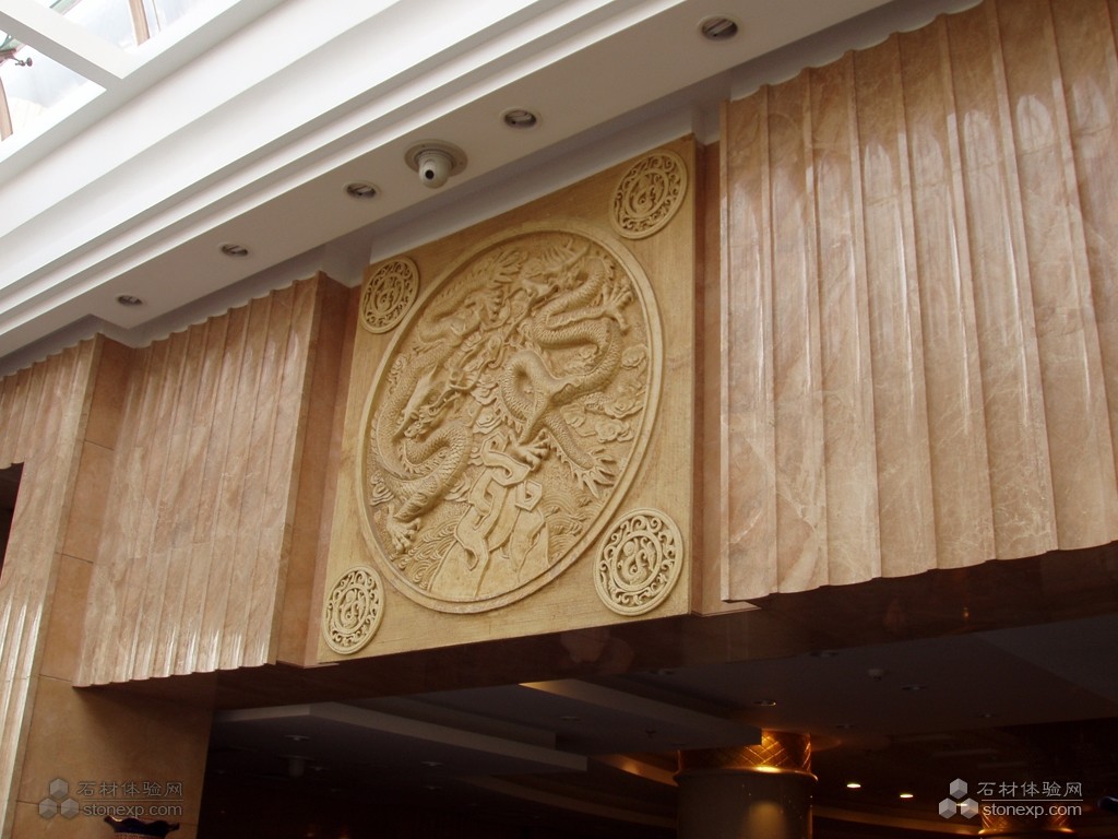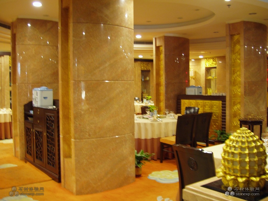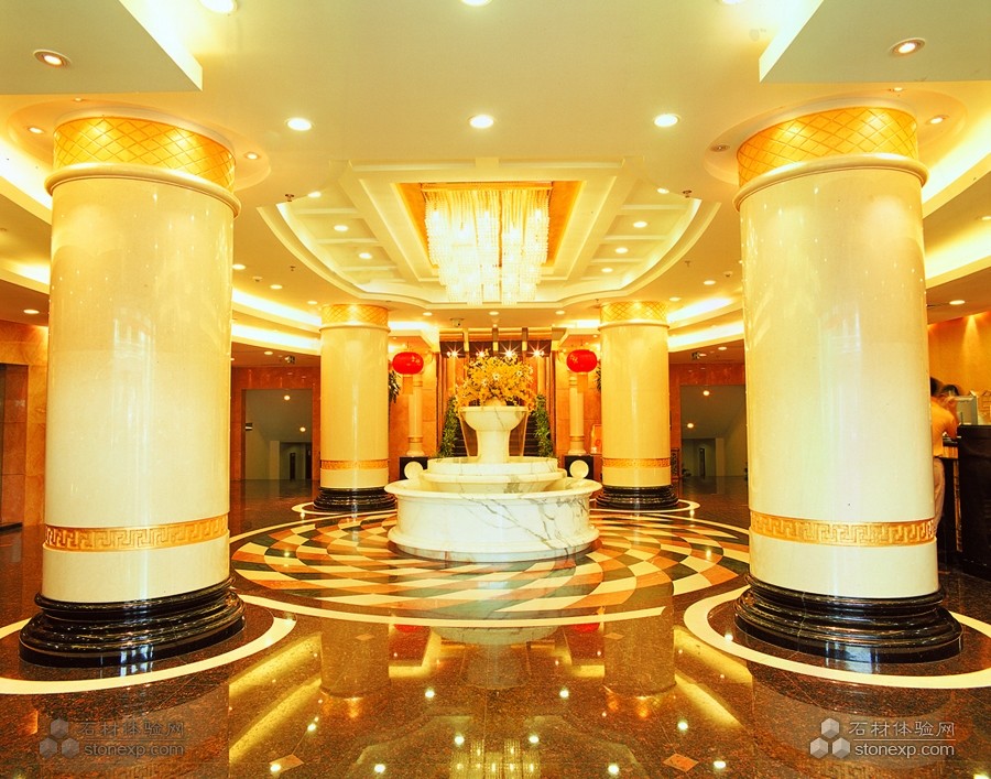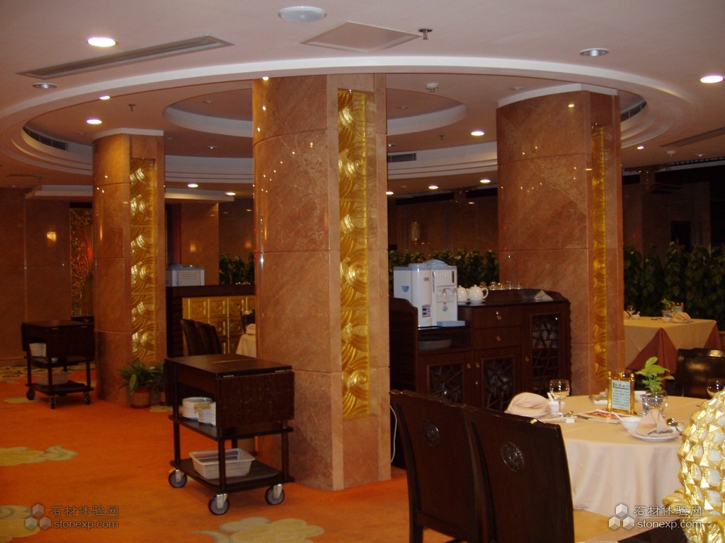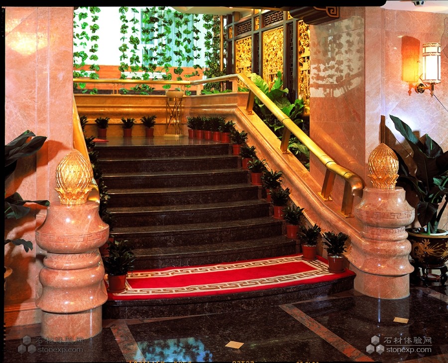 在北京金悅酒家這一工程中,大堂拼花、風水球、陽光廳石材屋頂及圓柱、橢圓柱、實心柱、雕刻、樓梯攔河石線等石材工藝得到淋漓盡致的表現,北京金悅酒家通過利用黑金色天然石材的高貴和紅色天然石材的熱情,展現了傳統中國風格與現代豪華地完美結合。