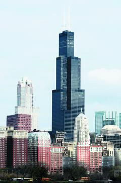 地鐵大廈,這棟暗紅色的、讓南京人非常自豪的南京第一高層全鋼結構的地標建筑,在遙遠的美國芝加哥竟有一個“孿生兄弟”——美國芝加哥著名的摩天樓——西爾斯大廈一隅的紅色高樓。乍看真的非常像,樓頂、正面、背面都是如出一轍,惟有側面南京地鐵大廈用了X形。
