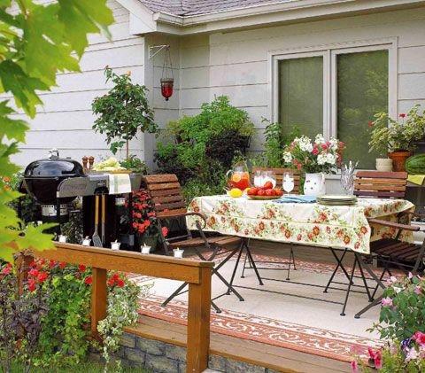桌布:選擇代有絢麗大花的桌布能營造出溫馨的田園氣氛,讓整個露臺充滿迷人的風情。這樣的桌布可以自己買面料制作。