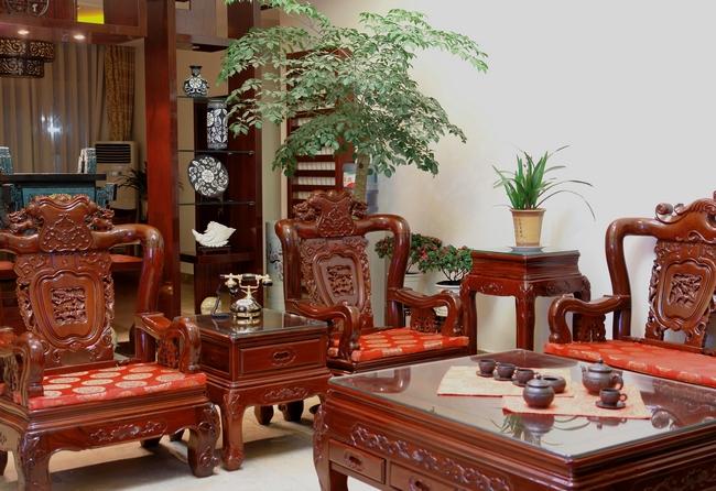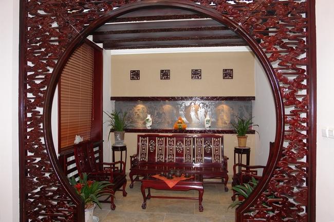 別墅的第一客廳是和門廳共處一室的。一套圓形的祥云鏤空隔斷,首先拉開了中式風格的帷幕!