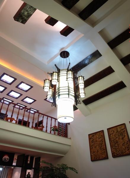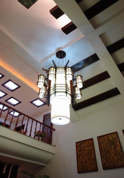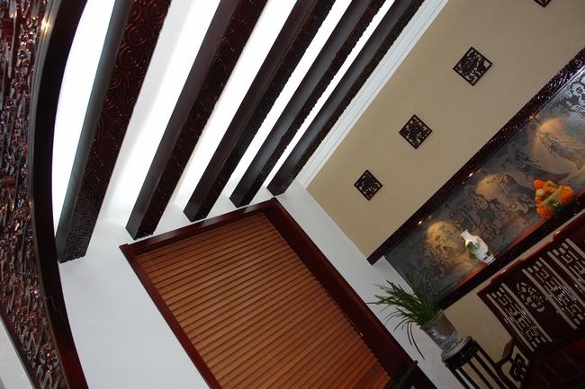再看對天花的設計處理。當別人感到畸形的空間是個棘手的問題的時候,我卻從中發現了凸顯這個別墅個性的表現符號——采用均衡的處理手法,將參差不齊的奧運卷云圖案的木雕梁穿過屋梁,從而營造一種既有傳統文化象征,又具有現代藝術審美情趣的空間氛圍。而與這些木雕梁呼應的二樓平臺上屋頂的不規則的方燈池,既給二樓的空間帶來相對獨立的空間界定,又讓整個空間形式流暢。