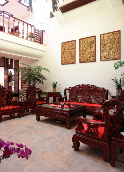 在客廳天花那些“雕梁畫棟”的貫穿下,從進門迎面的“富貴牡丹”開始,到沙發背景墻上方的三塊“歌舞升平”的木雕刻壁畫,再到二樓平臺上的方正構圖的牡丹雕刻,最后到影視墻上蜻蜓點水般的四塊小牡丹雕刻和一條卷云裝飾線,木雕這一中國傳統工藝形式,將別墅的中式味道體現得淋漓盡致。
