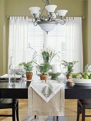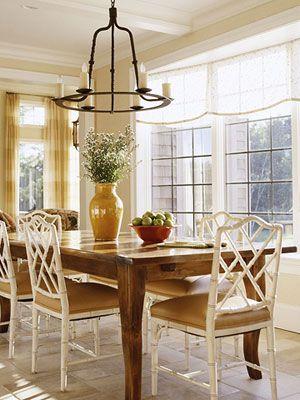 如果你的餐廳鄰近其它的起居空間。那么建議兩個空間用同一種顏色做基調(diào),再選擇一些不同的,但與主色調(diào)相近的小裝飾品點綴。本圖餐廳,主人就選用了淡黃色的紗簾,金黃色的椅套,使餐廳整體效果看起來和諧,明快。[page]