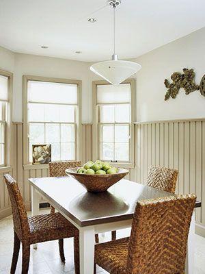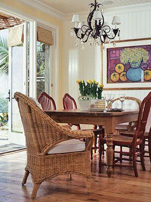 一張看似呆板的白底木面餐桌也能給餐廳帶來意想不到的活潑效果,簡單的長方桌搭配上藤條編制的座椅,使餐廳充滿了原始自然的味道。[page]