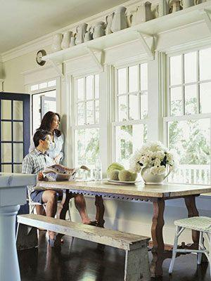 一張簡單的長條木餐桌搭配仿舊的木椅,自然的味道油然而生,仿佛與室外的藍天綠樹融為一體。餐桌上方陳列的一排主人收藏的瓷罐閃著奶白色的亮光,與周圍的環(huán)境相協(xié)調(diào)。[page]
