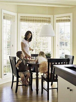 很多家庭都會在廚房留出空間作為餐廳,那么建議將之布置得越簡單越好。圖中的餐廳就在廚房一角,主人選擇了簡單的木拉簾,選用了樣式中規(guī)中矩的餐桌椅。雖然布置簡單,但干凈利落,使人神清氣爽。餐桌椅角底都是毛氈做成。避免了推來推去給地板造成的損害。[page]