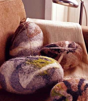 棉花糖一樣的沙發裝飾靠包看起來的確與眾不同,若想將綿軟散亂的材質制成這樣的靠包需要點時間和耐心,裝飾靠包上如同云霧般的各色紋路也需要幾種顏色不同的毛氈交織完成,搭配沉穩的素色調布藝沙發十分和諧。